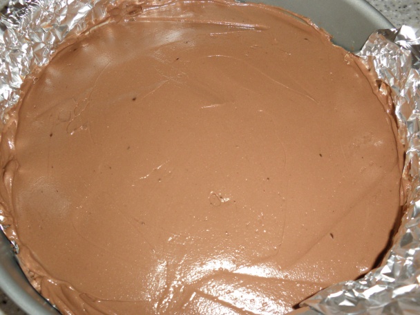 - Dann drücken wir die entstandene Masse in eine mit Alufolie belegte Tortenform.