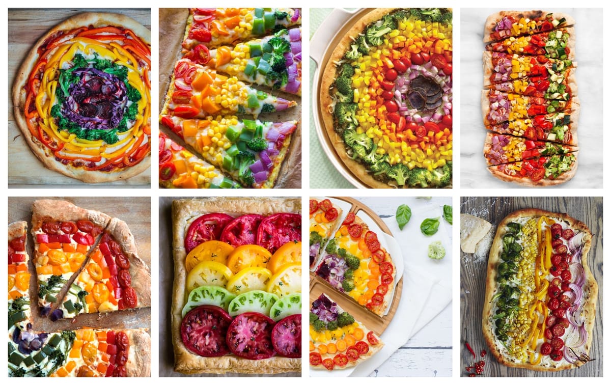 Diese Ideen für tolle Regenbogen-Pizza sind ein echter Hingucker! Man braucht nur das Gemüse in der richtigen farblichen Reihenfolge auf